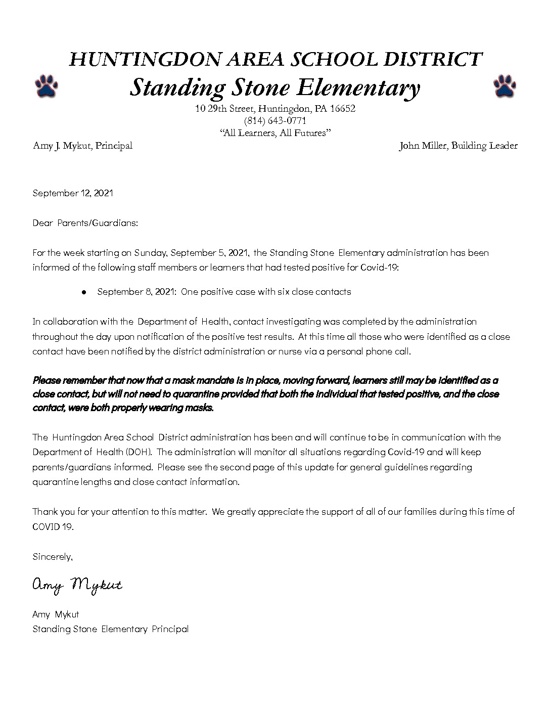 Sept 6-10 2021 STST Close Contact Letter – General notification