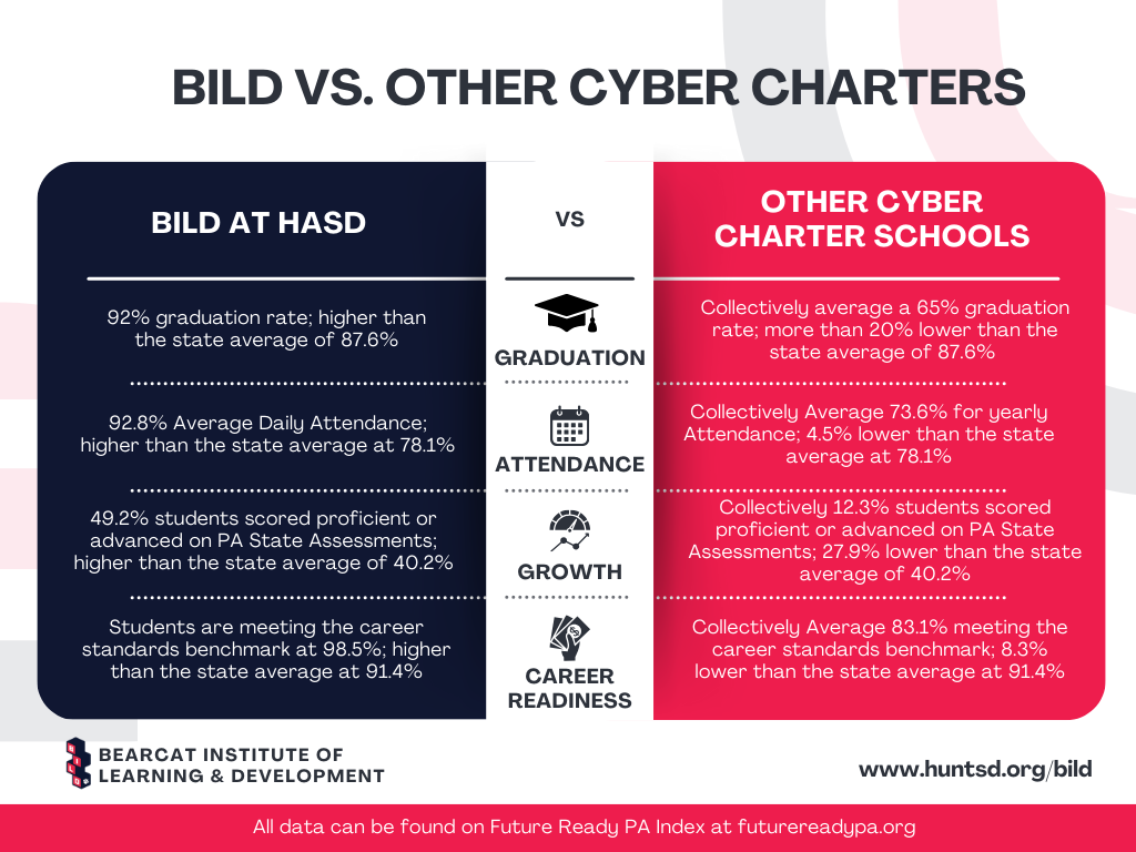BILD is a free K–12 online and hybrid learning program for students in the Huntingdon Area School District. We offer flexible learning options designed to meet students where they are. Our Elementary BILD Program provides 3 learning models: a fully online, hybrid, and a blended model with both at-home learning and on-site, community-focused learning experiences. At the Secondary level, students can choose fully online, hybrid, or part-time scheduling to best fit their needs, interests, and activities. With BILD, students learn their way—supported, connected, and rooted in the Huntingdon community.